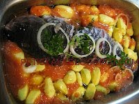 co seco, azeite, alho, cebola e tomate maduro triturado, juntamente com um pouco de pimentão doce. Acrescentei um pouco de salsa sobre o peixe.